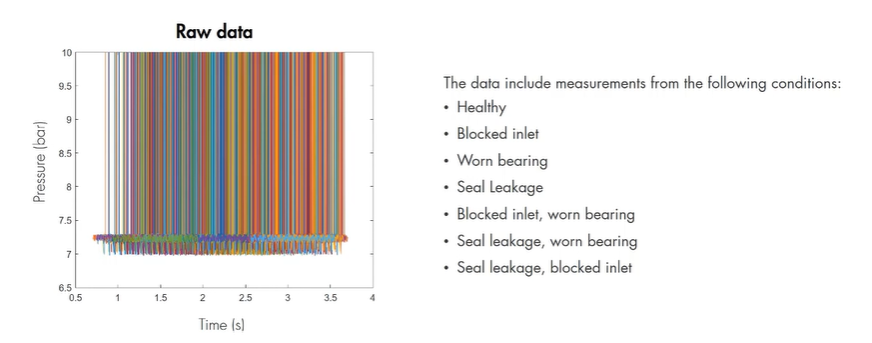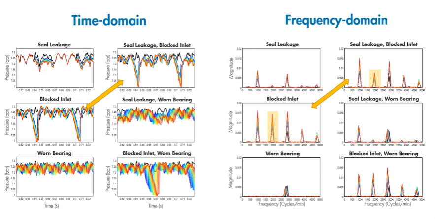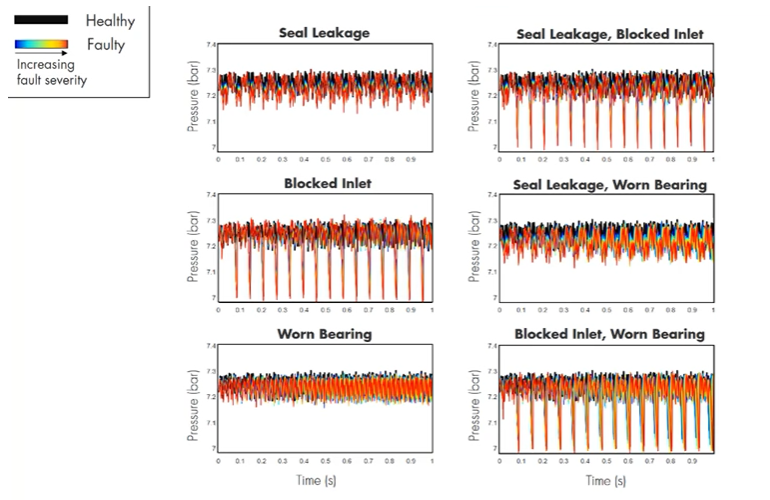 Seal Leakage, Blocked Inlet" 과 "Blocked Inlet"이 Time domain 분석에서 유사한 차트를 보여 분석이 어려웠으나 Frrequency domain을 보니 유의미한 특징이 보였음. 이는 머신러닝 모델 학습에 적합한 데이터로 보여짐.